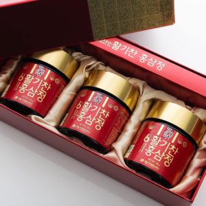 Chiết xuất hồng sâm cô đặc 6 năm tuổi (Thành phần rắn 60%, hàm lượng Rg1 Rb1 Rg3 chiếm 7mg/g, Hàn Quốc) chiếm 10%, Tỉ lệ thành phần nguyên liệu: rễ chính 70%, rễ phụ 30%,